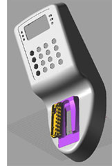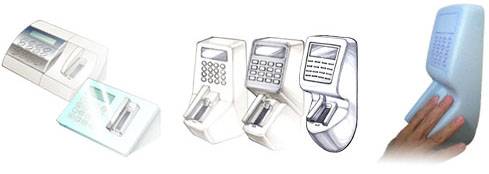 まず、液晶表示部・キー操作部と静脈認証部を横または縦に並べるアイデアをラフスケッチやラフモデルを通して十分に検討を重ね、どちらも使い勝手がよいことがわかった。それぞれの利点はあるが、OEM先が縦案を選び、差別化も考慮して自社ブランド品は横にした。